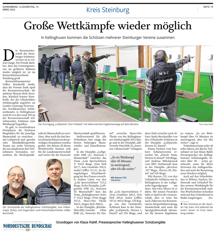 So finden zum Beispiel auf den Schießständen in Wilster, Itzehoe, Siethwende und Oelixdorf weitere Wettkämpfe für die Kreismeisterschaft statt. Das Wurfscheiben-Schießen findet auf dem Schießstand in Kaaks statt. Auch Nils Boysen (15 Jahre) von den Oelixdorfer Schützen war als Teilnehmer in der Luftgewehr Jugendgruppe am Start in Kellinghusen. „Das Ergebnis hätte besser sein können!“, so seine Aussage gegenüber dem Pressesprecher Klaus Rahlf von der Kellinghusener Schützengilde. Nils ist seit 2 Jahren dabei und hat mit seinen Freunden zum einen Spaß in der Gemeinschaft, aber es reizt ihn auch, die Konzentration, Körperbeherrschung, Atemtechnik und auch die Sportgerätetechnik intensiver für bessere Ergebnisse zu nutzen. „So ein Wettkampf über 45 Minuten ist durchaus anstrengend, aber ich übe weiter!“ so Nils Boysen zum Schluss.